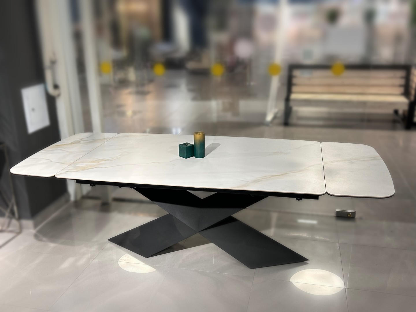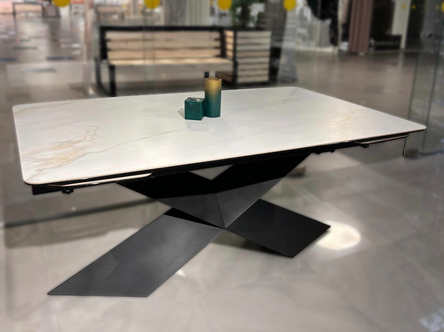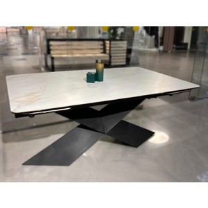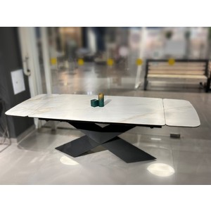 Раздвижной стол со столешницей из керамогранита сейчас в наличии. Посмотреть и оформить покупку можно по адресу салона-магазина в ТЦ Замок HOME в Минске.