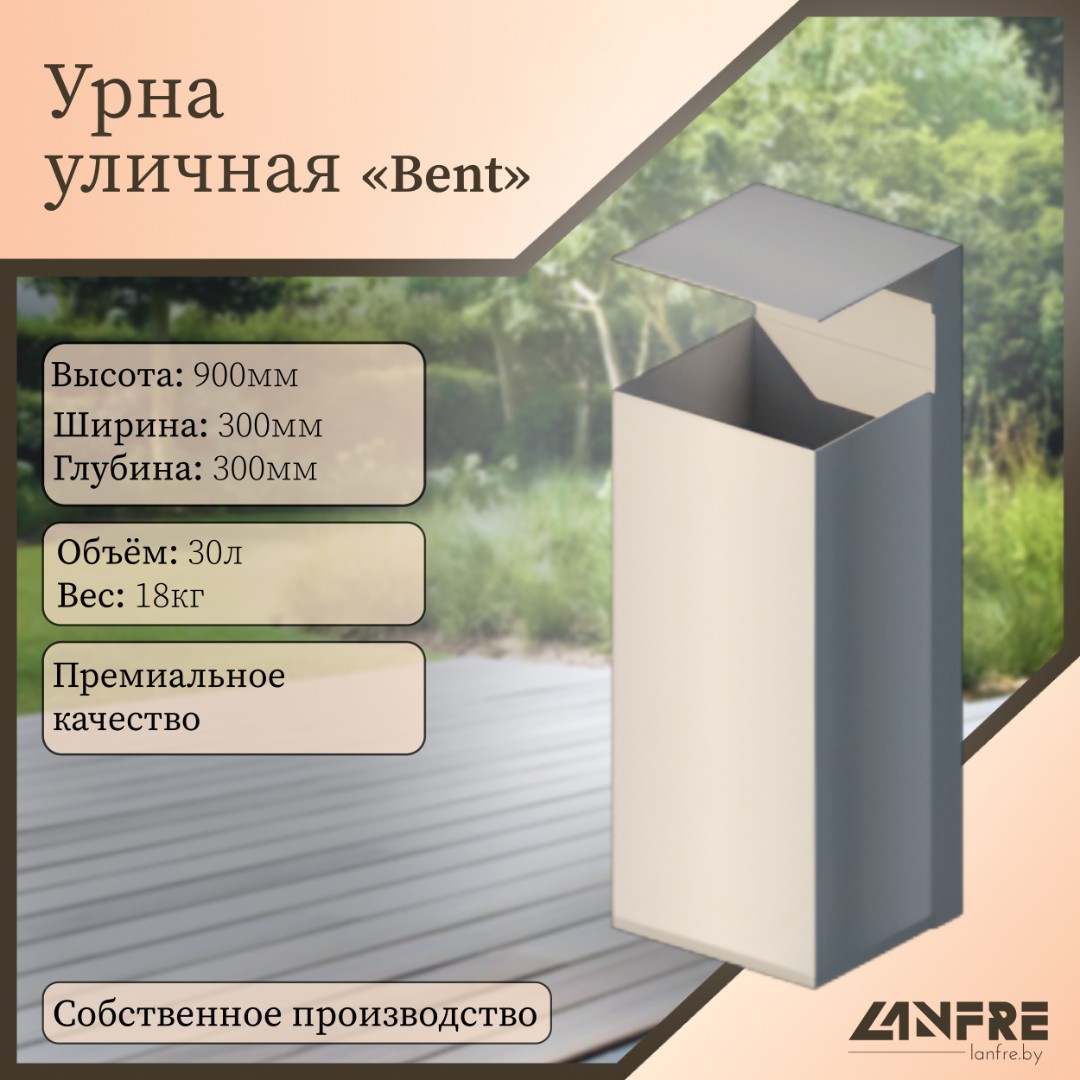 Урна BENT– современная городская урна для мусора. Устойчивая, надёжая конструкция и стильный дизайн - главные преимущества представленной модели. Она предназначена для установки на улицах города,возле подъездов, во дворах, парках, на дачных участках. Урна выполнена из листового металла с полимерным покрытием. Идеально впишется в любой экстерьер!