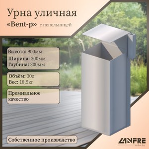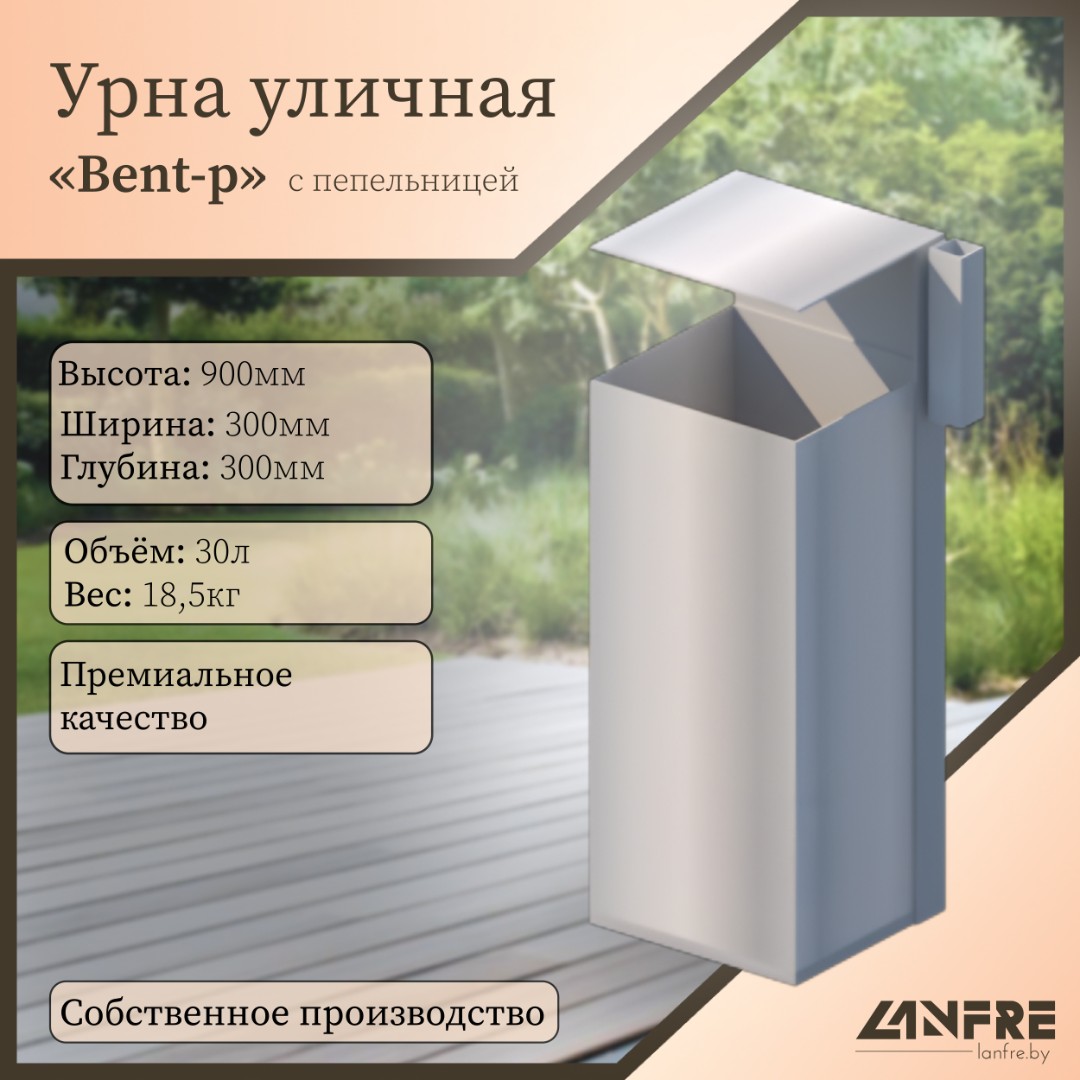 Урна BENT-P – современная городская урна для мусора с пепельницей. Устойчивая, надёжая конструкция и стильный дизайн - главные преимущества представленной модели. Она отлично подходит к любым типам наших скамеек. Урна выполнена из листового металла с полимерным покрытием. Пепельница выполнена из проф.трубы 50х50 мм.